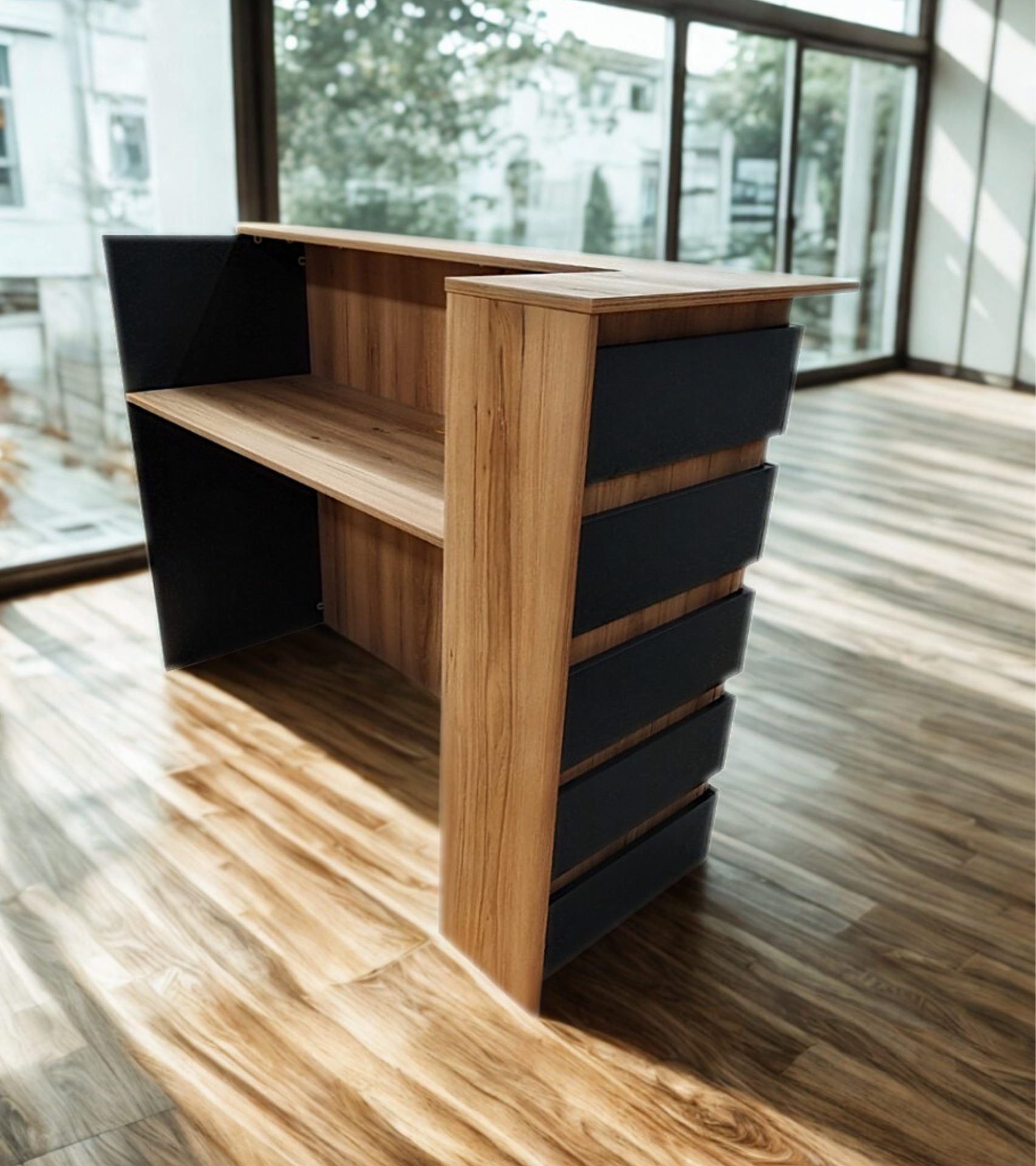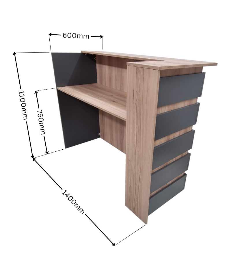 The compact dimensions of the Duke Reception Desk make it versatile and suitable for most reception areas or shop fronts. With a width of 1.4m, depth of 0.6m, and a height of 1.1m, it optimizes space without compromising functionality.